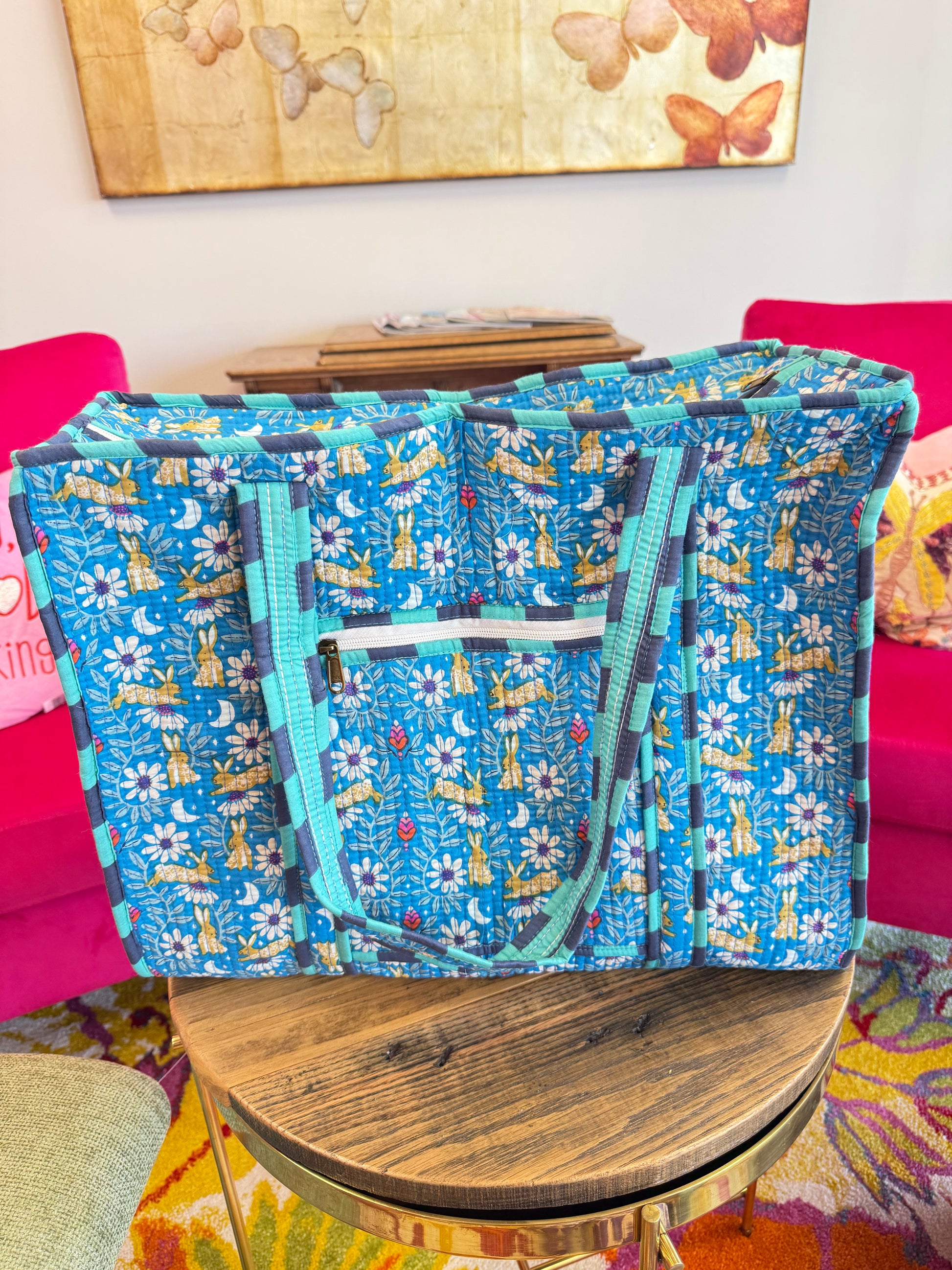 Large Quilted Tote Bag - Blue Contrast Flowers