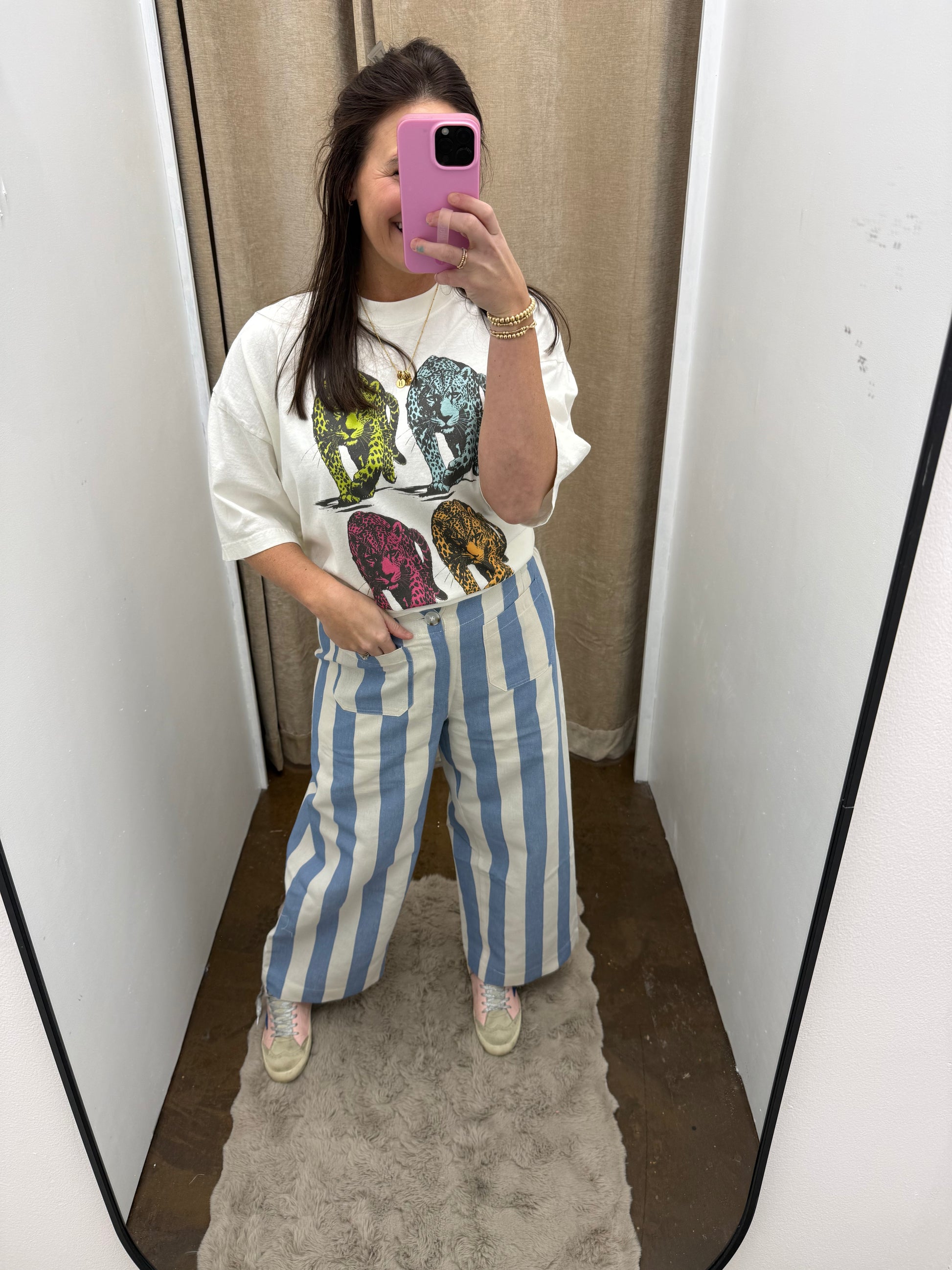 These vertical striped pants are the perfect way to elevate a simple top or your favorite graphic tee. Available in green, baby blue, black, or taupe stripes on a crisp white linen base, they’re lightweight, breathable, and effortlessly chic.